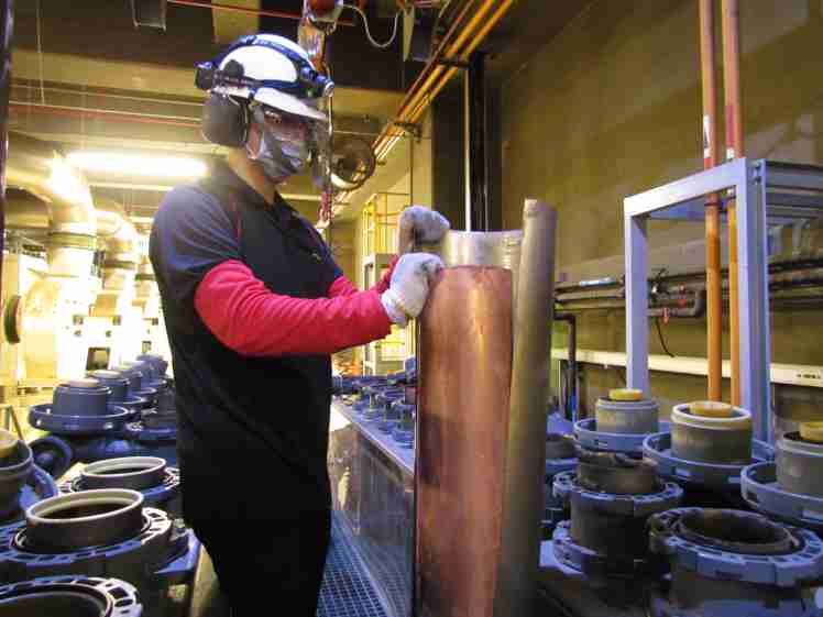 财神娱乐将废弃物转化成有效的工业或民生原物料,,图为废铜液淬炼后再制成纯度极高的铜管